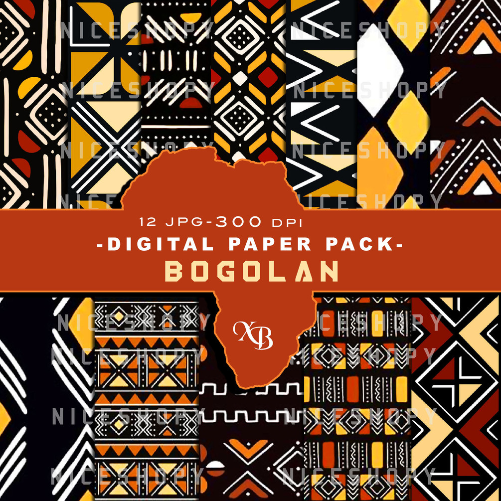 Ce Pack contient 12 Bogolan Patterns sans soudure haute qualité numérique imprimable. Chaque mesure 12 x 12 pouces, 300 DPI, JPEG papier.